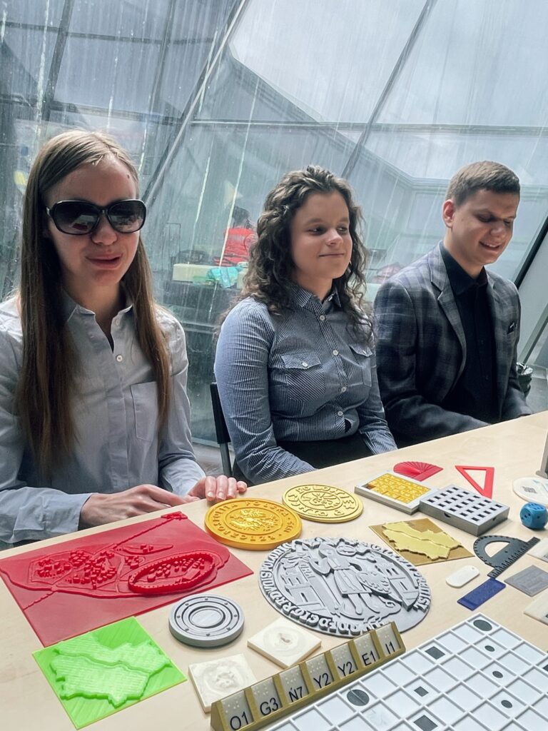 Opowiadaliśmy o tym, jak powstają nasze wydruki, o tym, jak osoby niewidome mogą projektować modele 3d i o tym, na czym w ogóle druk 3d polega. Wszyscy zainteresowani mogli też zobaczyć i dotknąć naszych wydruków oraz, we wtorek i środę, przyjrzeć się drukarce 3d przy pracy.